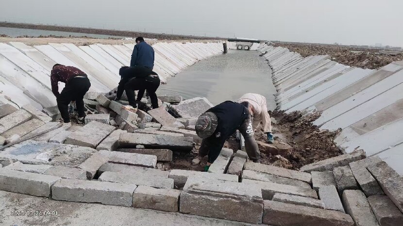 發(fā)現(xiàn)問題后,支部迅速行動,立刻組織分公司全體黨員放棄休息,對送水道護(hù)坡進(jìn)行全面加筑。搶修現(xiàn)場,黨員們分工明確,齊心協(xié)力。從清理土坡基礎(chǔ),到鋪設(shè)土工布,再到鋪壓加氣磚,各個環(huán)節(jié)緊密配合,每一道工序都做到精益求精。經(jīng)過兩天的連續(xù)奮戰(zhàn),共鋪設(shè)土工布100余米,重達(dá)200斤的加氣磚210塊,順利完成送水道護(hù)破工程。新護(hù)坡堅固耐用,外觀整齊,成為送水渠一道堅實的防護(hù)屏障。